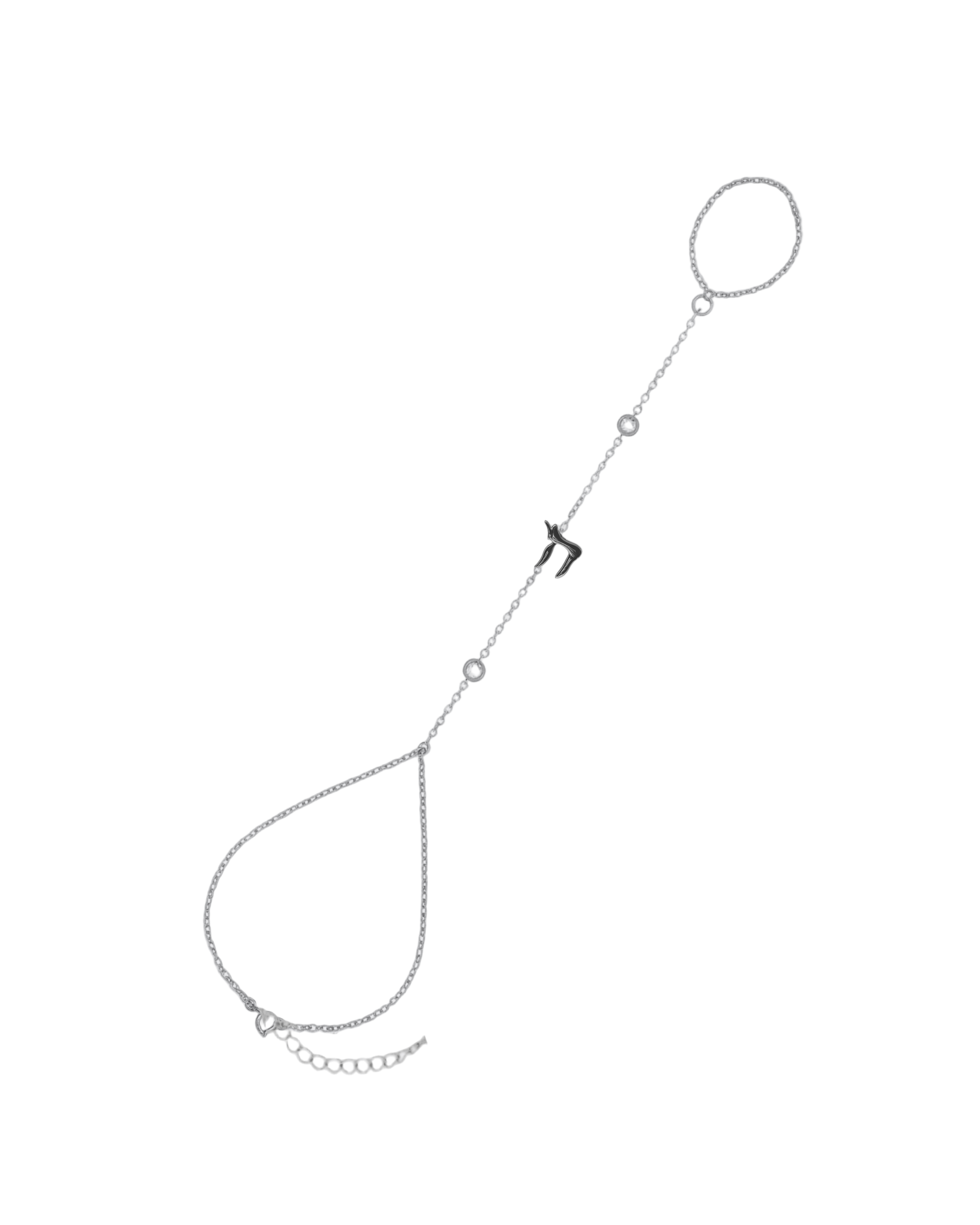 Crafted from solid 925 sterling silver, the Chai Statement Hand Chain connects the ring and wrist with a fine, minimalist chain — symbolizing life and continuity.